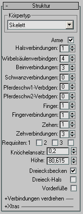 In der Gruppe "Xtras" können Sie zusätzliche Schwänze zum Biped hinzufügen. Zusätzliche Schwänze sind wie Pferdeschwänze. Dafür wird keine inverse Kinematik verwendet. Sie müssen sie mit Vorwärtskinematik, z. B. mit Rotations-Keys, animieren. Dafür müssen zusätzliche Schwänze nicht am Kopf befestigt werden.