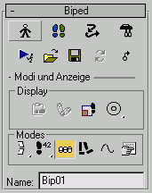 Mit den Steuerelementen im Rollout "Biped" können Sie den Biped in den Figur-, Schritt-, Bewegungsfluss- oder Mischermodus setzen und BIP-, STP-, MFE- und FIG-Dateien laden und speichern. Im Rollout "Biped" stehen noch weitere Optionen zur Verfügung.