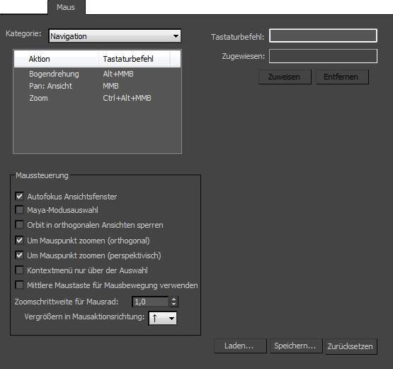 Beim Laden, Speichern oder Zurücksetzen von benutzerdefinierten Mauseinstellungen verwendet 3ds Max das MUSX-Dateiformat. Die Vorgabeeinstellungen werden in
