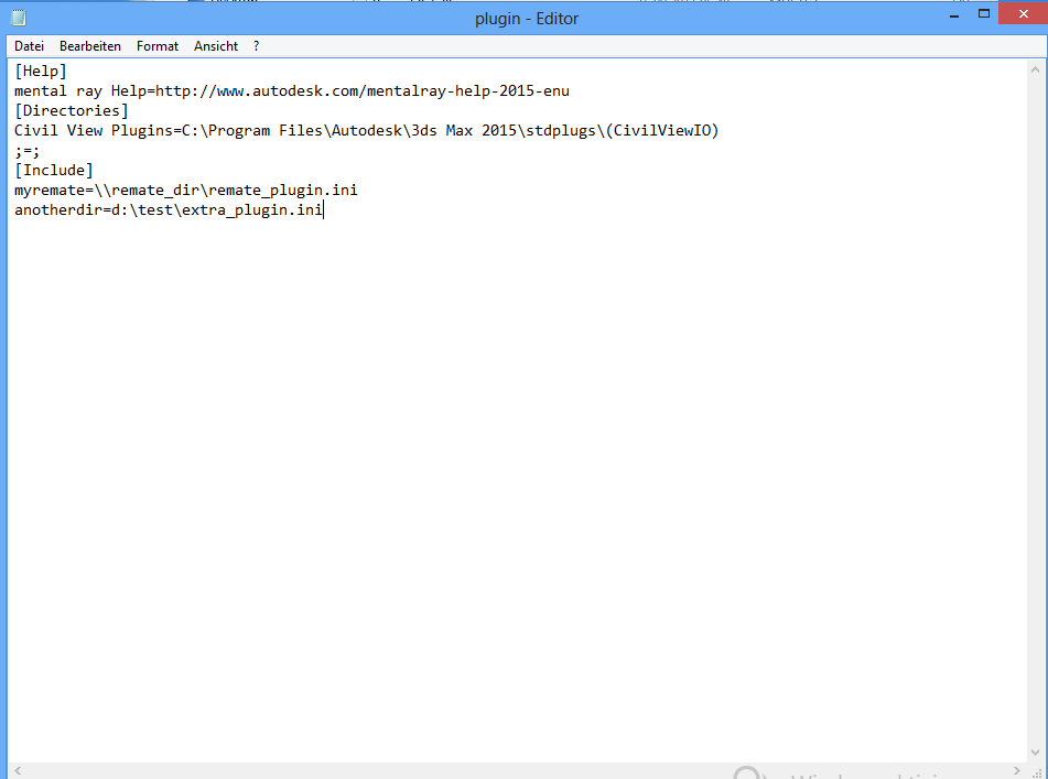 Sie können Pfade zu weiteren INI-Dateien in der lokalen Datei plugin.ini eintragen, damit 3ds Max diese Dateien verarbeitet, als wären sie Bestandteil der ursprünglichen Datei plugin.ini. Dies kann bei Einstellungskonfigurationen sehr nützlich sein, in denen verschiedene Systeme innerhalb eines Netzwerks dieselben Plug-Ins verwenden. Der Netzwerkadministrator verwaltet nur eine einzige entfernte INI-Datei, anstatt jedes Gerät einzeln aktualisieren zu müssen.