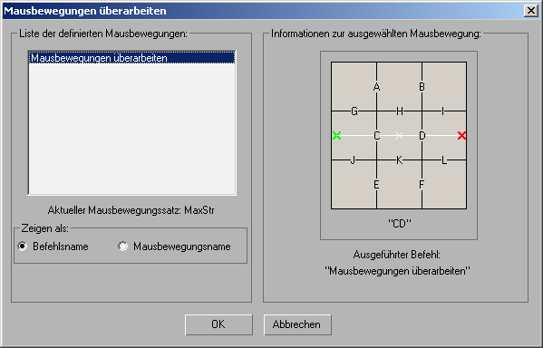 - Entfernt den ausgewählten Befehl (bzw. die Mausbewegung) aus der Liste. Die Verbindung zwischen Befehl und Mausbewegung wird aufgehoben.