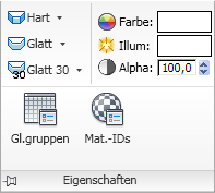 Mit der Gruppe "Eigenschaften" können Sie die Netzglättung, Scheitelpunktfarben und Material-IDs anpassen. Sie steht auf allen Objekt- und Unterobjektebenen zur Verfügung. Die verfügbaren Befehle hängen von der Ebene ab.