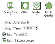 Die Gruppe "Auswählen" enthält die Hilfsmittel "Spitzen", "Offen" und "Muster" für Unterobjektauswahlen auf allen Ebenen, zusätzlich das Hilfsmittel "Hart" für das Auswählen von Kanten an den Rändern von Glättungsgruppen sowie weitere Auswahlhilfsmittel für Polygone.