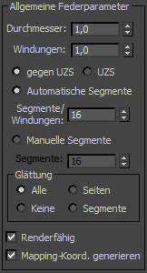 Das Federobjekt nimmt die Form einer gewundenen Feder an, mit der Sie in Animationen eine flexible Feder simulieren können. Sie können den Gesamtdurchmesser und die Länge der Feder, die Anzahl der Windungen sowie den Durchmesser und die Kontur des „Drahts“ festlegen. Wenn Sie die Feder an zwei "bindenden" Objekten befestigen, folgt sie der Bewegung.