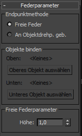 Mit diesen Steuerelementen wählen Sie die Objekte aus, an die die Feder gebunden ist. "Oben" und "Unten" sind willkürlich festgelegte Bezeichnungen; die zwei gebundenen Objekte können jede Art von Positionsbeziehung zueinander haben. Um die Bindung zu vervollständigen, wählen Sie zwei Bindungsobjekte aus, und klicken Sie dann auf An Objektdrehp. geb.