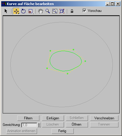 Dieses Dialogfeld ist modusunabhängig. Sie können das Hauptfenster von 3ds Max verwenden, während das Dialogfeld Kurve auf Oberfläche bearbeiten geöffnet ist. Wenn Sie jedoch einen anderen Kurventyp oder ein Unterobjekt, das keine Kurve ist, auswählen, wird das Dialogfeld geschlossen.