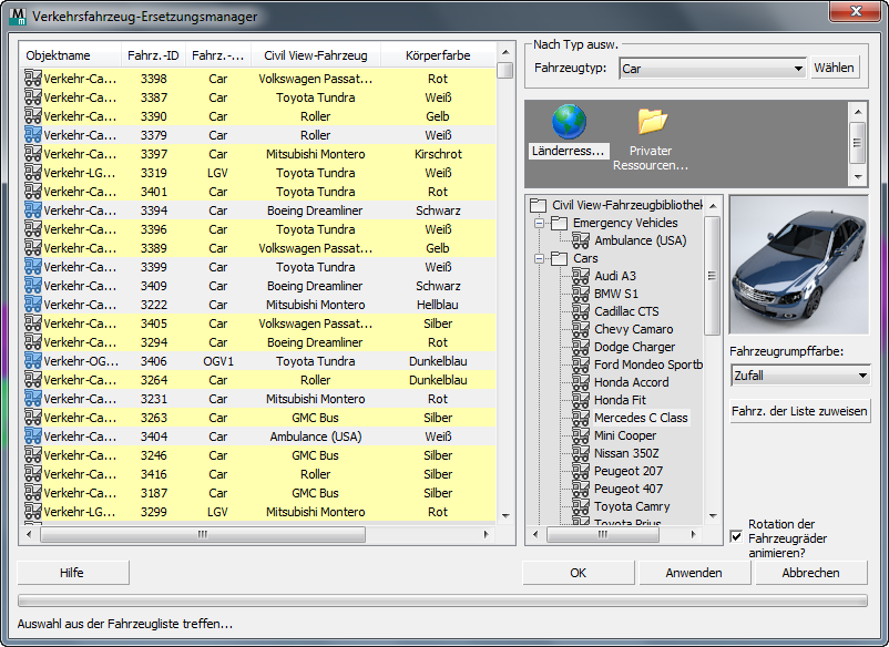 Damit können Sie nach dem Zufallsprinzip oder gezielt Civil View-Fahrzeugtypen auswählen, die auf bestimmte Einträge in der Liste der Fahrzeugobjekte anzuwenden sind.