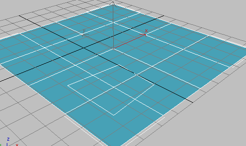 Vorgabemäßig ist das Ebenenobjekt in 4 x 4 Polygone unterteilt. Wenn die Polygone in der Perspektivansicht nicht angezeigt werden, drücken Sie F4, damit der Ansichtsmodus "Flächen mit Kanten" aktiviert wird.