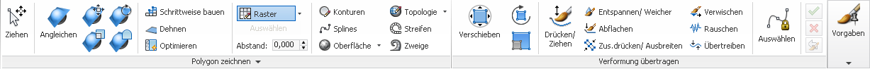Die Registerkarte "Freiform" enthält Hilfsmittel zum Erstellen und Ändern von Polygongeometrie durch "Übertragung" in den Ansichtsfenstern. Außerdem bietet das Register "Vorgaben" Möglichkeiten zum Laden und Speichern von Pinseleinstellungen.