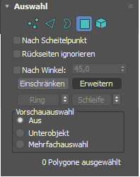 Unten im Rollout "Auswahl" befindet sich eine Textanzeige mit Informationen zur aktuellen Auswahl. Bei Auswahl von keinem oder mehreren Unterobjekten werden im Text die Nummer und der ausgewählte Typ angegeben. Beispiel: "4 Polygone ausgewählt." Wenn nur ein Unterobjekt ausgewählt ist, enthält der Text die ID-Nummer und den Typ des ausgewählten Unterobjekts. Beispiel: "Polygon 73 wurde ausgewählt."
