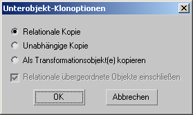 Wenn Sie beim Klonen eines Oberflächen- oder Kurvenunterobjekts gleichzeitig die UMSCHALTTASTE drücken, wird das Dialogfeld Klonoptionen angezeigt, in dem Sie aus dem Klon eine relationale Kopie, eine unabhängige Kopie oder ein Transformationsobjekt machen können.