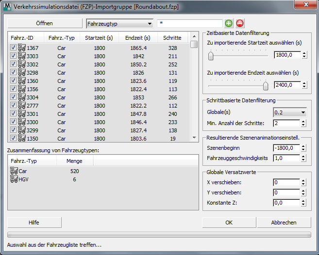 Durch Erhöhen des Schrittintervalls kann die Anzahl der generierten Keys pro Fahrzeug beträchtlich reduziert werden. Beim Importieren eines großen Datensatzes kann diese Funktion durchaus wichtig sein. Der Nachteil ist allerdings, dass das Verringern der Key-Anzahl auch die Genauigkeit der Animation verringert.