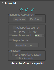 Dieses Rollout enthält Steuerelemente zum Aktivieren und Deaktivieren der verschiedenen Unterobjekt-Modi, zum Arbeiten mit benannten Auswahlen und Haltepunkten sowie Anzeige-Einstellungen und Informationen über ausgewählte Elemente.
