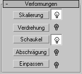 Auf die Extrusions-Verformungskurven greifen Sie über das Rollout "Verformungen" in der Modifikatorgruppe zu. In der Erstellungsgruppe stehen Verformungen nicht zur Verfügung. Sie müssen die Modifikatorgruppe öffnen, nachdem Sie die Loft-Extrusion erstellt haben, um auf das Rollout "Verformungen" zugreifen zu können. Das Rollout enthält folgende Optionen: