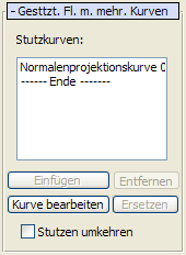 Die Liste "Stutzkurven" zeigt die Namen der ausgewählten Kurven an. "Stutzen umkehren" kehrt die Stutzrichtung um. Mit "Normalen umkehren" können Sie die Oberflächennormalen beim Erstellen umkehren. (Nach dem Erstellen können Sie die Normalen mit den Steuerelementen des Rollouts "Oberfläche allgemein" umkehren.)