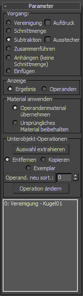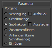 Mithilfe dieser Optionen können an booleschen Objekten vierseitige Tesselierungen vorgenommen werden. Das Objekt wird damit auf die Bearbeitung der Unterteilungsoberflächen und die Glättung der Netze sowie auf die Konvertierung in das Format "Bearbeitbares Poly" vorbereitet.