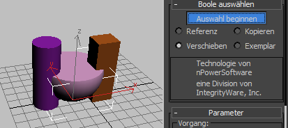 Dann können Sie einen oder mehrere Operanden entweder mithilfe der Standardauswahlmethoden im Ansichtsfenster oder durch Markieren der entsprechenden Namen in der Hierarchieliste im unteren Bereich des Rollouts "Parameter" auswählen.