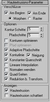 Im Rollout "Hautextrusions-Parameter" stellen Sie die Komplexität für das Netz des Extrusionsobjekts ein. Darüber hinaus können Sie hier das Netz optimieren, indem Sie die Flächenanzahl festlegen.