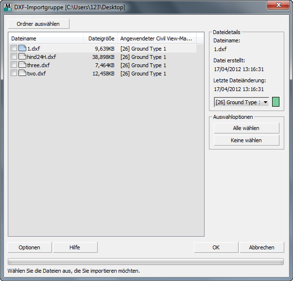 Mit dieser Option können Sie Daten aus mehreren DXF-Dateien gleichzeitig in Civil View importieren.