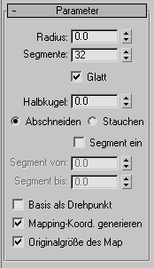 Durch Erhöhen der Werte wird die Kugel nach und nach gekürzt, sodass, beginnend mit der Basis, ein Kugelausschnitt entsteht. Gültig sind Werte im Bereich von 0,0 bis 1,0. Mit der Vorgabe (0,0) entsteht eine Vollkugel. Eine Einstellung von 0,5 erzeugt eine Halbkugel, und bei 1,0 ist keine Kugel mehr vorhanden. Vorgabe = 0,0.