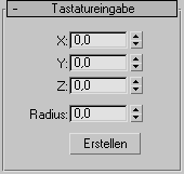 Das Rollout "Tastatureingabe" enthält einen allgemeinen Satz an Positionsfeldern mit den Bezeichnungen X, Y und Z. Die eingegebenen Zahlen sind Abstände entlang der Achsen der aktiven Konstruktionsebene. Dies ist entweder das Grundraster oder ein Rasterobjekt. Plus- und Minuswerte entsprechen positiven und negativen Richtungen für diese Achsen. Vorgabe = 0,0,0: der Mittelpunkt des aktiven Rasters.