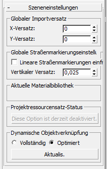 Legt X- und Y-Versatzwerte für eingehende importierte Daten fest. Dies kann nützlich sein, wenn Quelldaten in einem realen Koordinatensystem generiert wurden. Solche Koordinatensysteme sind nicht für die Verwendung in 3ds Max geeignet und können sich stark auf die Systemgenauigkeit und -leistung auswirken.