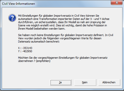 Beim Importieren von Modelldaten, die einen Wert ungleich Null aufweisen, berechnet Civil View die X- und Y-Versatzwerte, und fordert Sie dazu auf, diese festzulegen: