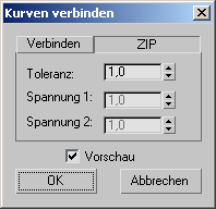 Ein Abstand in 3ds Max-Einheiten. Liegen die Enden der beiden Ausgangskurven näher zusammen als dieser Abstand, wird durch eine Schnellverbindung einer der Punkte oder KS gelöscht, um die Erstellung mehrerer Punkte oder KS an derselben Position in der neuen, durch Schnellverbindung erstellten Kurve zu vermeiden.