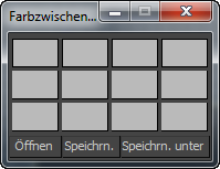 Zeigt eine verschiebbare Zwischenablage mit 12 Feldern sowie Schaltflächen zum Öffnen und Speichern von Farbzwischenablagedateien an. Sie können beliebig viele dieser Zusatzfenster gleichzeitig öffnen und minimieren. Wenn Sie die Dienstprogrammgruppe verlassen oder die Farbzwischenablage durch Klicken auf die Schaltfläche "Schließen" beenden, bleiben alle angezeigten Zusatzfenster offen. Wenn Sie ein Zusatzfenster schließen, gehen alle Änderungen an den Werten verloren.
