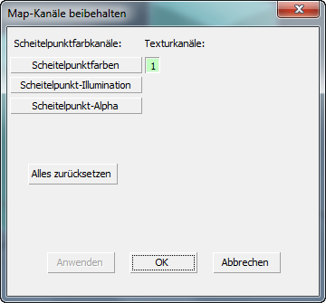 In diesem Dialogfeld sind Schaltflächen für alle verfügbaren Scheitelpunktfarbkanäle und Texturkanäle, die Daten enthalten, vorhanden. Die Anzahl und die Art der eingeblendeten Schaltflächen sind je nach Objektstatus unterschiedlich. Sie können beispielsweise mit dem Modifikator "Scheitelp. übertr." und dem Dienstprogramm "Kanalinfo" geändert werden.