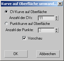 Mit dieser Schaltfläche wird das Dialogfeld "Kurve auf Oberfläche erstellen" aufgerufen, über das Sie die gewählte Kurve in eine KS- oder Punktkurve auf einer Oberfläche umwandeln können. Nach der Umwandlung können Sie die neue Kurve auf der Oberfläche mit den Steuerelementen für Kurven auf Oberflächen bearbeiten (zum Beispiel mit dem Dialogfeld "Kurve auf Oberfläche bearbeiten").