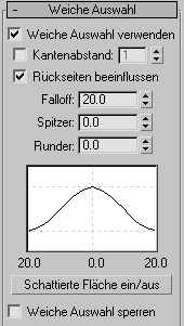 Mit den Steuerelementen in diesem Dialogfeld können verschiedene Parameter für "Weiche Auswahl" geändert werden. Für alle Unterobjektebenen gelten dieselben Parameterwerte für "Weiche Auswahl". Die Option "Weiche Auswahl" ist für NURBS-, Netz-, Poly- , Patch- und Spline-Objekte verfügbar.