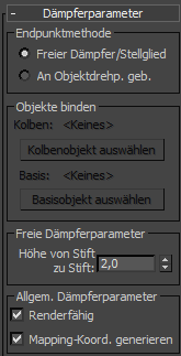 Mit diesen Steuerelementen wählen Sie die Objekte, an die der Dämpfer gebunden ist. Um die Bindung zu vervollständigen, müssen Sie zwei Bindungsobjekte auswählen und dann auf "An Objektdrehp. geb." klicken.