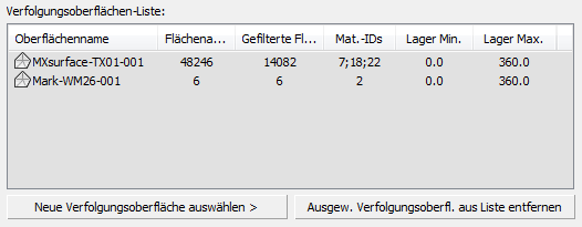 Listet die Verfolgungsoberflächen auf, die ausgewählt wurden.