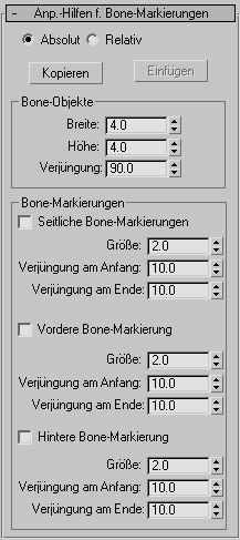 Mithilfe der Steuerelemente im Rollout "Anp.-Hilfen für Bone-Markierungen" können Sie einige Aspekte der Bone-Geometrie, einschließlich der Bone-Markierungen, anpassen.
