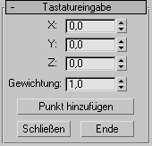 Mit dem Rollout "Tastatureingabe" können Sie eine NURBS-Kurve über die Tastatur erstellen. Mithilfe der Tabulatortaste können Sie die verschiedenen Steuerelemente im Rollout auswählen. Wenn Sie eine Schaltfläche über die Tastatur aktivieren möchten, drücken Sie die Eingabetaste, wenn die betreffende Schaltfläche aktiv ist.