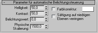 Der Befehl "Automatische Belichtungssteuerung" sampelt das gerenderte Bild und erstellt ein Histogramm, um im gesamten dynamischen Bereich des Renderergebnisses einen guten Farbauszug zu liefern. Dadurch lassen sich Beleuchtungseffekte hervorheben, die ansonsten zu schwach wären, um sichtbar zu sein.