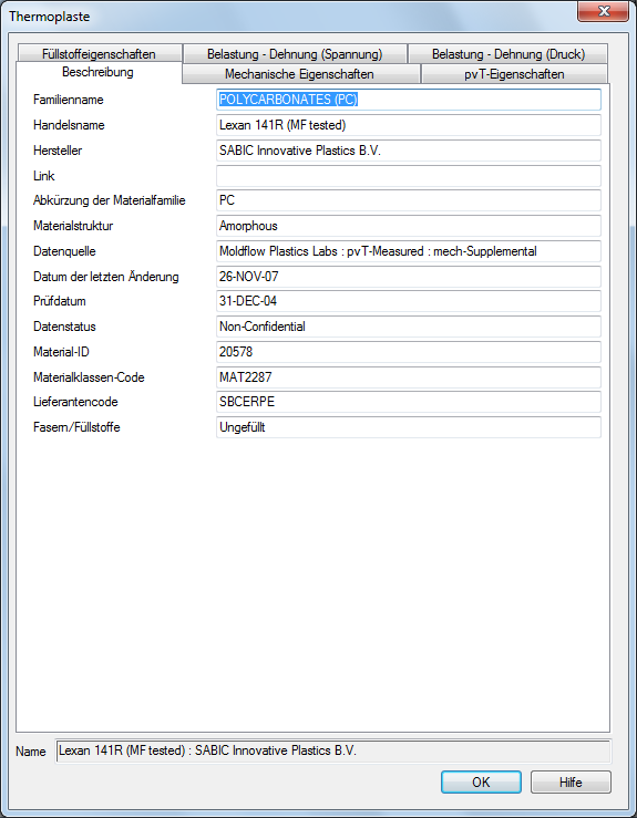 Klicken Sie auf zum Überprüfen der Materialdaten. Im angezeigten Dialogfeld können Sie die Materialbeschreibung, die mechanischen Eigenschaften, die Füllstoffeigenschaften und die Spannungs-/Dehnungsdaten anzeigen. Sie können auf dieses Dialogfeld auch über zugreifen.