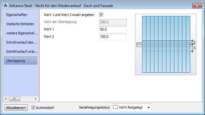 Wenn die Fassadenprofile überlappen, kann die Überlappung durch einen oder zwei Werte festgelegt werden. Die Überlappungswerte können positiv, negativ oder gleich Null sein.