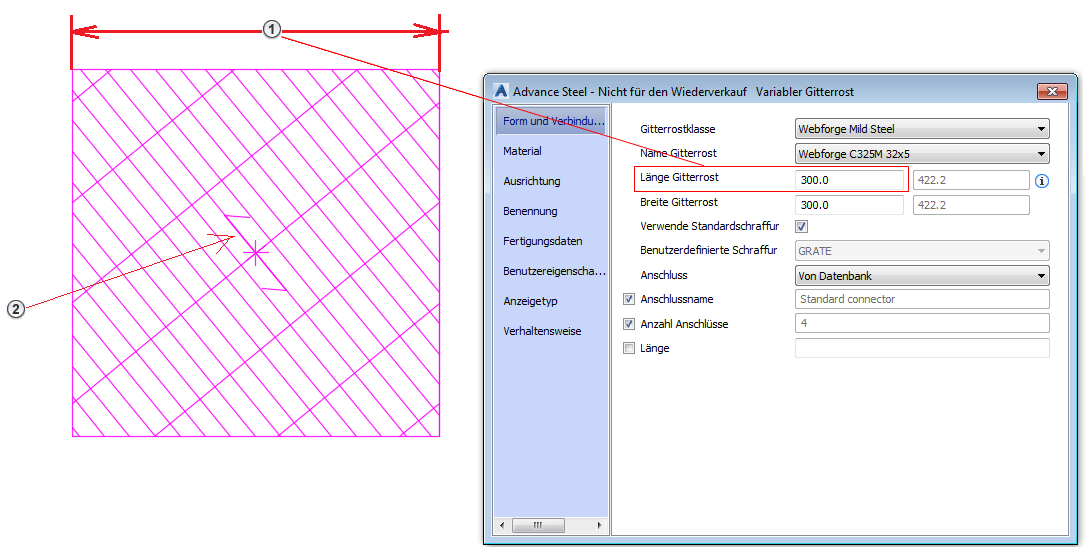 Grau angezeigte Werte: Zeigt die berechnete Breite des Begrenzungsrahmens für den variablen Gitterrost an. Diese Werte werden anhand des Rechtecks mit der kleinsten Fläche berechnet, das in das Rechteck für den modellierten Gitterrost passt und an dessen Lastrichtung ausgerichtet ist. Die Größe dieses Gitterrosts ist von Bedeutung, da der Gitterrost aus einem Stück Gitter gefertigt wird, dessen Lastrichtung in seiner Längsrichtung ausgerichtet ist. Anschließend wird er für den benötigten modellierten Gitterrost passend zugeschnitten. Bearbeitbare Werte: Dieser Wert ändert die sichtbare Form des rechteckigen Gitterrosts entlang des Breitenwerts, wobei die Lastrichtung ignoriert wird. ![]()