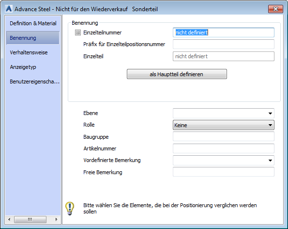 Das Kontrollkästchen vor der Einzelteil- und Hauptteilnummer kann nicht geändert werden. Es zeigt lediglich an, ob der Träger ein Hauptteil oder ein Anbauteil ist.