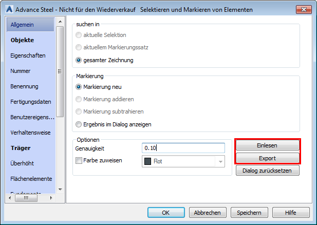Derselbe Vorgang für Import und Export gilt auch bei Vorlagen für Stücklisten in Zeichnungen. Um das Fenster Selektieren und Markieren von Elementen zu öffnen, wählen Sie Listen Sortierung Inhalt auf der Registerkarte Ausgabe, Gruppe Stückliste in Zeichnung.