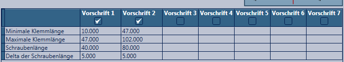 Navigieren Sie zurück zur Registerkarte Parameter und definieren Sie die Regeln, die für die in der ersten Tabelle der Registerkarte Schrauben eingegebenen Schraubenlängen verwendet werden sollen.