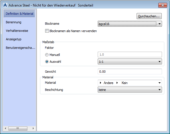 Auf dieser Registerkarte des Dialogfelds Eigenschaften können Sie das Gewicht, das Material und den Skalierfaktor beim Einfügen für Sonderteile festlegen.