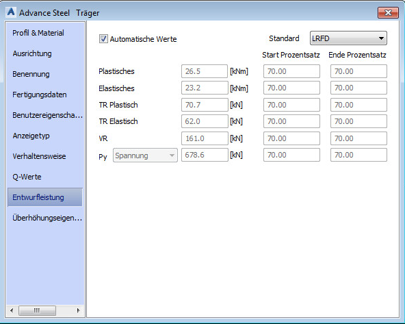 | Plastisches Moment | Die plastische Torsionswiderstandsgrenze des Trägers wird aus dem plastischen Biegefestigkeitsmoment und der Streckspannung des Trägermaterials berechnet. Das Plastizitätsmodul des Querschnitts wird aus der Datenbank AstorProfils.mdf, die Streckspannung des Materials aus AstorBase.mdf gelesen. |