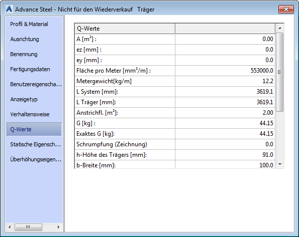 Auf dieser Registerkarte des Dialogfelds Träger Eigenschaften sind die geometrischen Eigenschaften des Trägers und die geometrischen Werte des Profils aufgeführt.