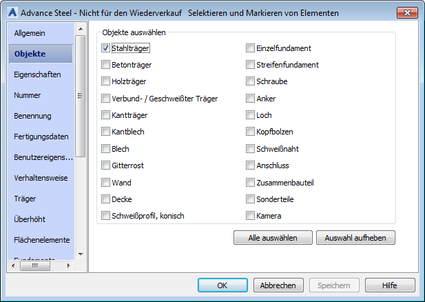Wählen Sie auf der Registerkarte Objekte den Typ oder die Typen von Objekten, die in dieser Farbe angezeigt werden sollen.