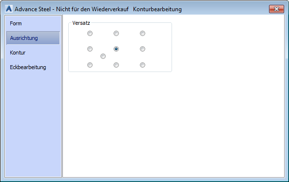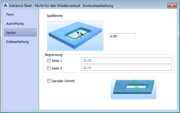In diesem Abschnitt wird die Bearbeitung der Eigenschaften von Blechkonturen über die dafür vorgesehenen Registerkarten im Dialogfeld Konturverarbeitung beschrieben.