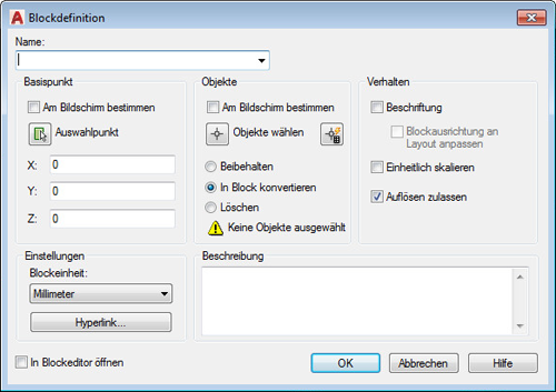 - Nachdem der Bereich definiert ist, wandeln Sie ihn in einen AutoCAD®-Block mit einem bestimmten Namen um, der von Advance Steel mit dem Befehl BLOCK als reservierter Bereich erkannt werden kann.