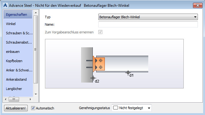 Der Anschluss Betonauflager Blech-Winkel kann nur zwischen bestimmten Typen von Betonelementen (Wand, Decke, Träger) und einigen der Stahlprofile (I, T, C, L, geschweißt, zusammengesetzt oder mit Entformungsschräge) verwendet werden.